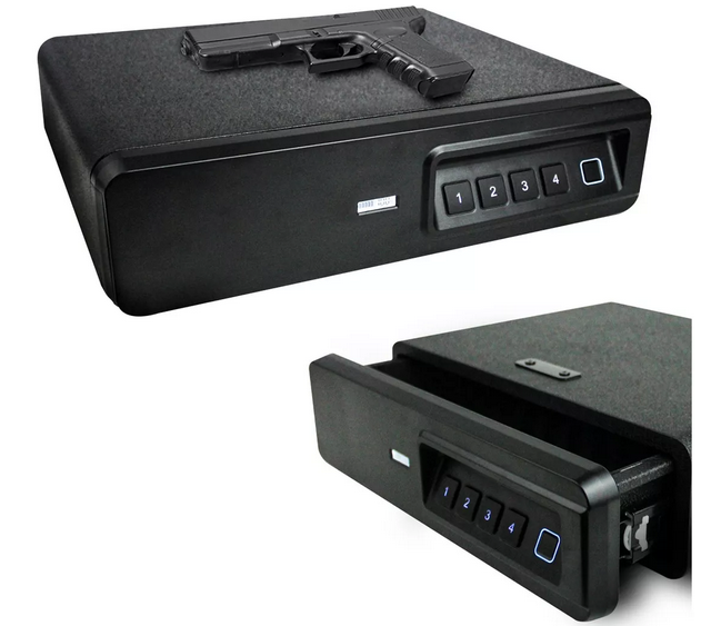 Mantenha sua arma armazenada com segurança e ao alcance da mão com o cofre de mesa biométrico de acesso rápido. Esta solução de segurança inovadora apresenta um design compacto que permite que você armazene discretamente sua arma ao alcance e fora de vista.